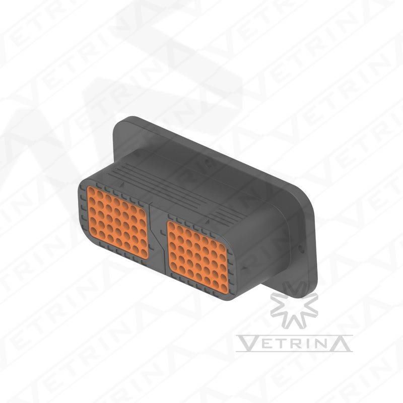 Cód. Vetrina: 43112010 O DRC12-70PA é um conector receptáculo da TE Connectivity Deutsch, série DRC. É uma carcaça para 70 terminais macho (pino), tamanho 16. Possui flange para montagem em painel (bulkhead), codificação A e formato retangular. Ideal para aplicações seladas em ambientes severos.